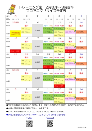 【トレーニング室フロアエクササイズ予定表(2/8更新)】