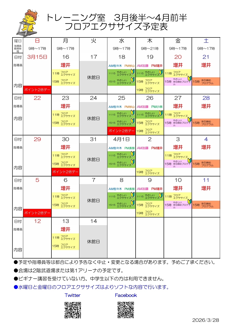 【トレーニング室フロアエクササイズ予定表(3/28更新)】