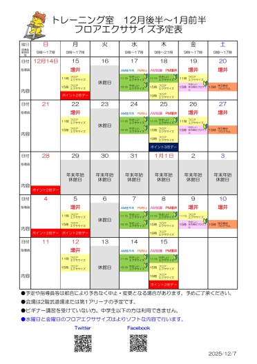 【トレーニング室フロアエクササイズ予定表(12/7更新)】