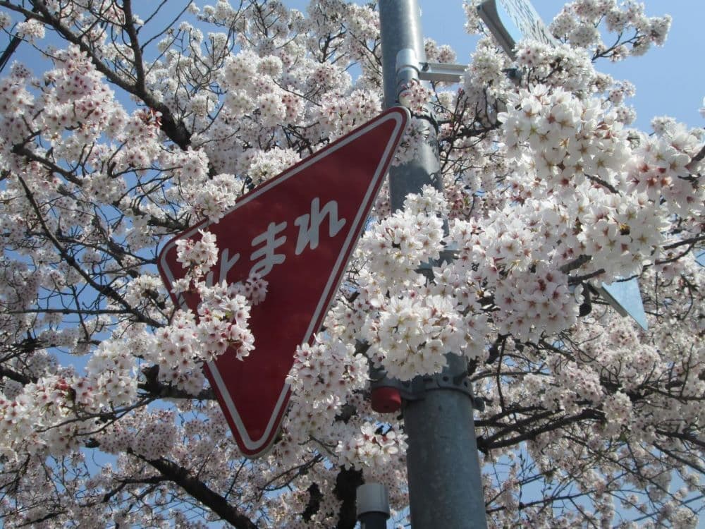 桜たちが見てみてと言わんばかりの大主張、止まれ!の看板は桜を見せるためのアピール?!