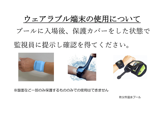 ウェアラブル端末(スマートウォッチ)の利用について 秩父市温水プールでは、安全面からスマートウォッチ(ウェアラブル端末等以下「スマートウォッチ」)の着用を禁止していましたが、健康増進を目的として以下の条件にてご利用いただけるようになりました。